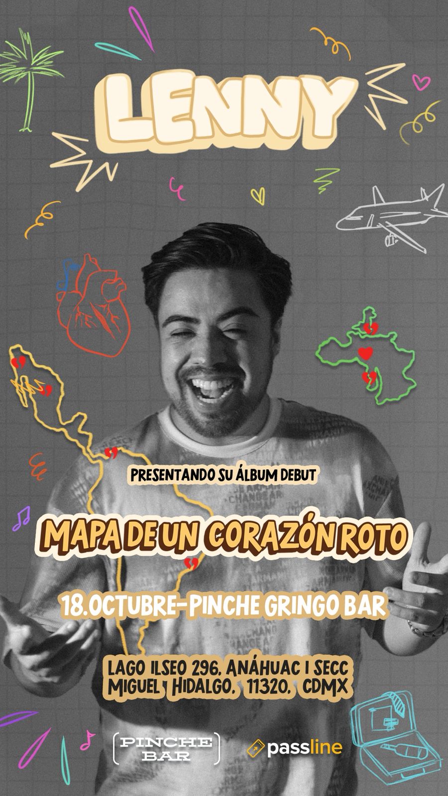 El rock mexicano se llena de nuevas emociones y horizontes sonoros con el lanzamiento de “Mapa de un corazón roto”, el álbum debut de Lenny, cantante y compositor mexicano que ha decidido trazar con música la cartografía emocional de una ruptura amorosa. Este material será presentado oficialmente el 18 de octubre en el Pinche Gringo Polanco, ubicado en Lago Iseo 296, colonia Anáhuac 1ª Sección, alcaldía Miguel Hidalgo, en un concierto íntimo que promete ser una experiencia sensorial y emocional completa. El evento dará inicio a las 7 de la noche, con boletos disponibles a través de Passline y una atractiva promoción 2×1, un gesto del artista hacia su público para celebrar este momento tan esperado.
